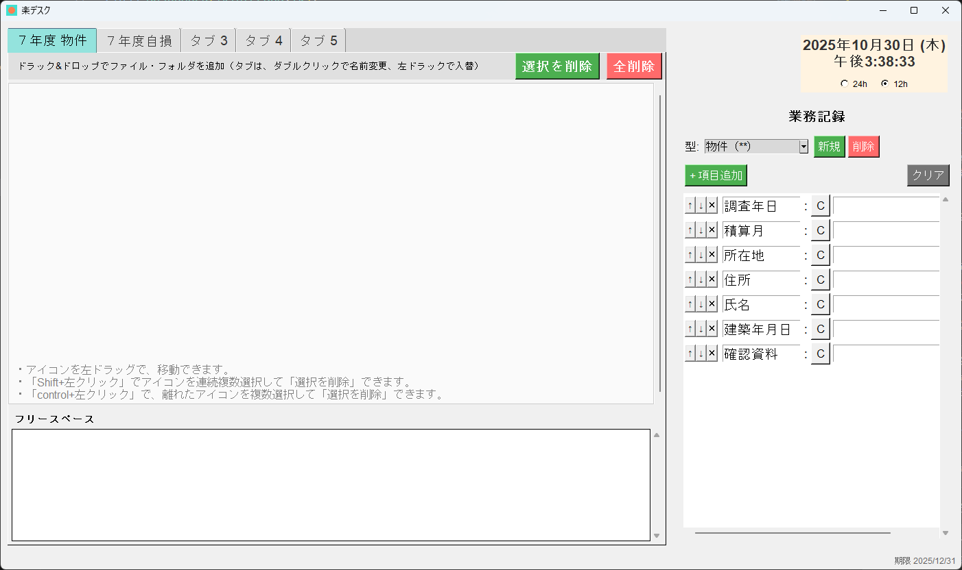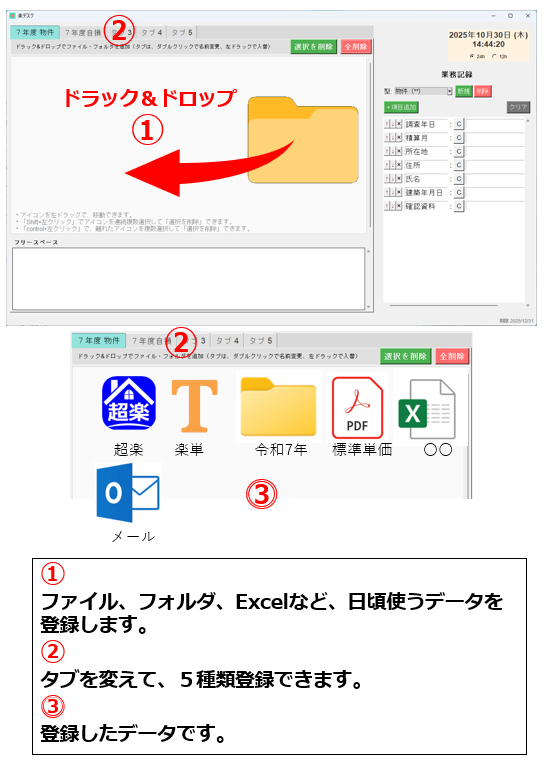 <楽デスク>とは、各業務ごとに使う、 フォルダ、ファイル、ソフトをまとめて表示します。 該当フォルダ(ファイル)を、探す手間が省けます。